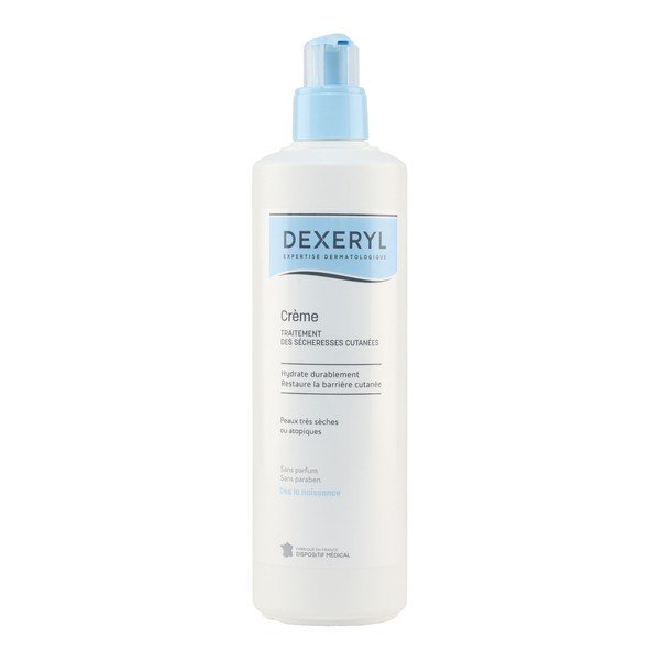 Dexeryl DM 500ml en flacon pompe Dexeryl Crème Sécheresses Cutanées 500 g est une crème qui répare et hydrate durablement les peaux sèches ou atopiques, notamment dans le cadre de certaines dermatoses (dermatite atopique, ichtyoses., etc…). Sa formule unique traite les symptômes de la peau sèche et crée un film protecteur qui évite la déshydratation et aide à protéger la peau des agressions extérieures. Sans parfum, elle permet de limiter et de prévenir les irritations. Sans parfum. Sans paraben. Fabriquée en France