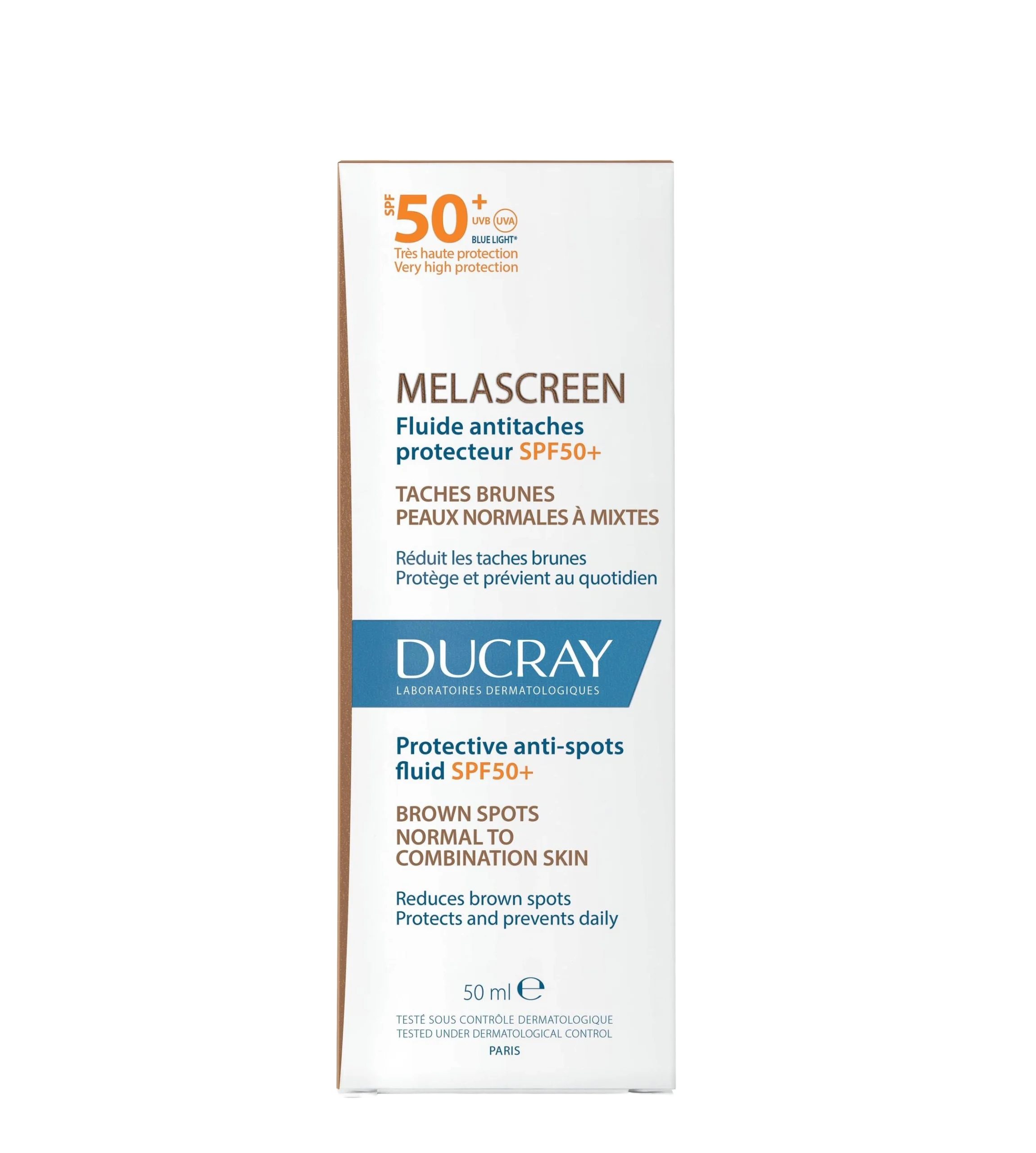 Ducray Melascreen Fluide Antitaches SPF50+ est le premier fluide antitaches quotidien offrant une très haute protection. Il prévient et réduit l’apparence des taches brunes. Tout en protégeant la peau contre les UVB, UVA courts et longs, la lumière bleue et les effets nocifs de la pollution.
