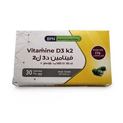 BPN Biophytonutrial Vitamine D3 K2 est un complément alimentaire en gélules, combinant vitamine D3 et K2 pour soutenir la santé osseuse. Chaque gélule contient 5000 UI de vitamine D3, et 100 mcg de vitamine K2. À prendre par voie orale pour un apport optimal en vitamines essentielles.