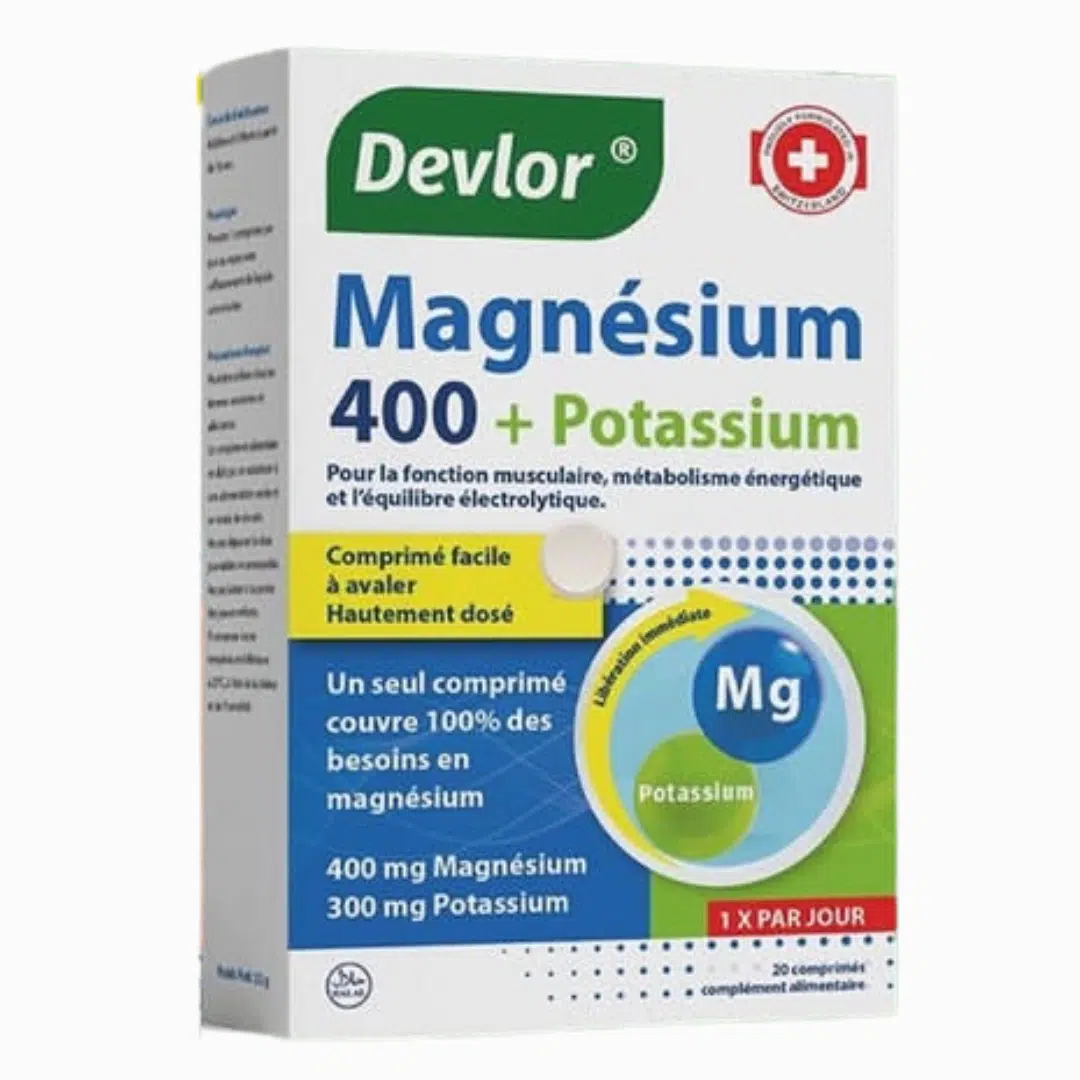 Devlor Magnésium 400 + Potassium : complément alimentaire pour l’énergie et l’équilibre musculaire Formule synergique combinant magnésium et potassium, deux minéraux essentiels au bon fonctionnement musculaire, nerveux et énergétique.