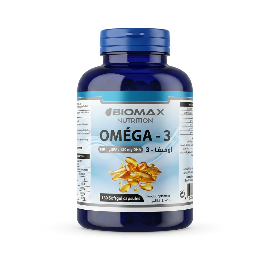 BIOMAX NUTRITION Oméga-3 est un complément alimentaire de haute qualité conçu pour soutenir la santé cardiovasculaire, cérébrale et articulaire. Les acides gras essentiels EPA (180mg) et DHA (120mg) sont reconnus pour leurs nombreux bienfaits, notamment la réduction du risque de maladies cardiaques, l’amélioration de la fonction cognitive et la diminution de l’inflammation. Une supplémentation en Oméga-3 est particulièrement importante dans nos sociétés modernes où l’alimentation est souvent déséquilibrée.