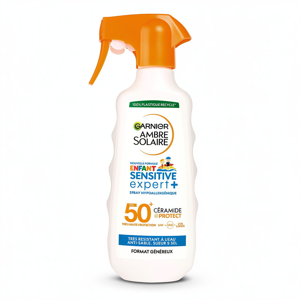 GARNIER Ambre Solaire – Spray Gâchette Sensitive Expert+ Enfant – Haute Protection Solaire FPS 50+ – Protège des UVA, UVB & UVA Longs – À Base De Céramides – Peaux Sensibles – 270 ml