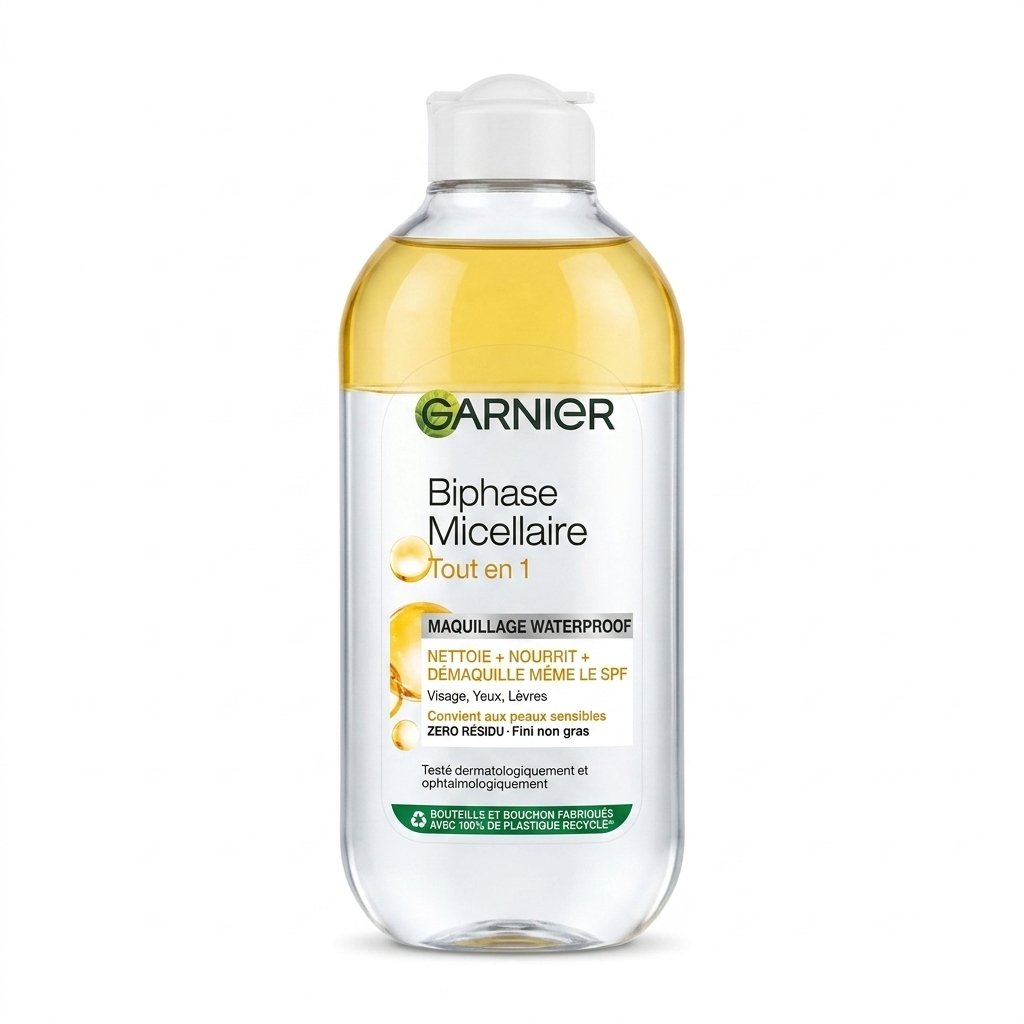 La Biphase Micellaire Tout en 1 de Garnier est une solution démaquillante révolutionnaire qui combine l’efficacité des micelles et le pouvoir nourrissant des huiles. Conçue pour répondre aux besoins des peaux les plus sensibles, elle élimine en douceur le maquillage, même waterproof, tout en laissant la peau hydratée et confortable. Dites adieu aux sensations de tiraillement et bonjour à une peau visiblement plus saine et éclatante.